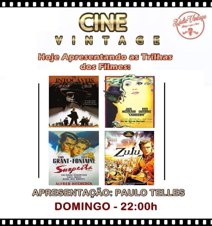 Para começar o mês de maio, Paulo Telles apresenta, em seu programa dominical na webrádio Vintage, quatro grandes compositores do cinema. Lembrando que o “Cine Vintage” é “A sala de cinema das noites de domingo“. Não percam amantes da sétima arte. Abaixo o roteiro do programa deste domingo dia 1º de maio com reprises na quinta feira dia 5 de maio às 22 horas e sábado dia 7 de maio às 17 horas.