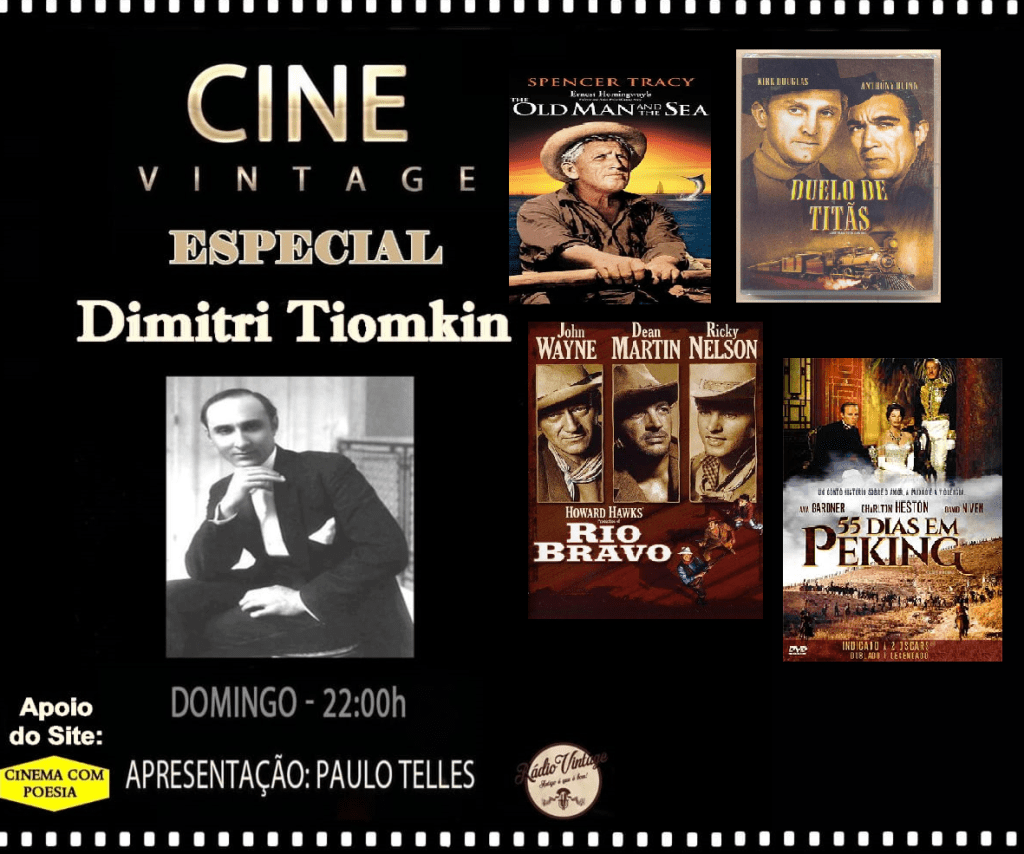 Paulo Telles preparou o Especial Compositor do Mês de Junho no capricho para os amantes do cinema clássico. O Compositor Dimitri Tiomkin (1894 – 1979) foi um compositor estadunidense de origem judaica ucraniana. Compôs as trilhas dos seguintes filmes, entre outros: Matar ou Morrer, Disque M para Matar, Um Fio de Esperança, O Velho e o Mar, Os Canhões de Navarone, 55 Dias em Pequim, O Álamo, A Queda do Império Romano, entre outros. Recebeu vinte e duas indicações ao Oscar e o ganhou quatro vezes pelas trilhas sonoras de Matar ou Morrer, Um Fio de Esperança e O Velho & O Mar, além de uma por melhor canção original por The Ballad of High Noon pelo filme de mesmo nome. Fique ligado no programa dominical da webrádio Vintage. Sempre com quatro grandes sucessos do cinema, confira o roteiro do programa deste domingo dia 26 de junho com reprises na quinta feira dia 30 de junho às 22 horas e sábado dia 2 de julho às 17 horas. Lembrando que o “Cine Vintage” é “A sala de cinema das noites de domingo“.