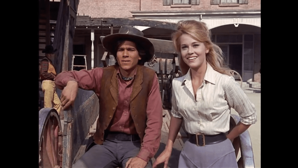 Jane Fonda tinha 28 anos, era seu nono filme, quando estrelou esse western satírico adaptado do romance “The Ballad of Cat Ballou“, de Roy Chanslor, publicado em 1956, que na verdade era um faroeste clássico, sem o tom cômico do roteiro de Walter Newman e Frank Pierson. A história é centrada na bela Catherine Ballou (Fonda) que, ao voltar para sua cidade natal, descobre que seu pai, o rancheiro Frankie Ballou (John Marley) está sendo ameaçado por uma empresa que quer desesperadamente sua terra. Quando ele é assassinado pelo implacável Tim Strawn (Lee Marvin), Cat busca aliados em busca de vingança, e contrata o famoso Kid Shelleen (Lee Marvin), que mal se aguenta em pé pois é um incorrigível bêbado.