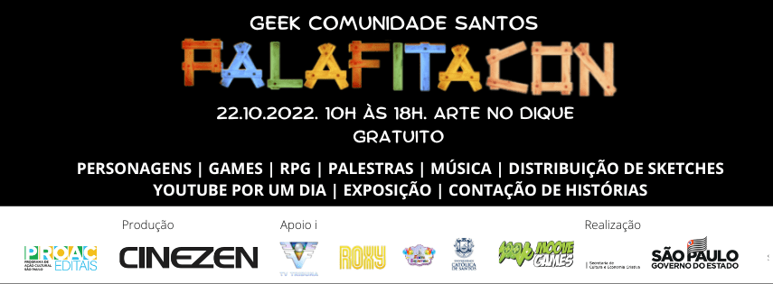 Com o objetivo de proporcionar a experiência do mundo geek a quem não tem chance de frequentar os demais eventos, aconteceu em 17 de agosto de 2019 a PalafitaCon. Idealizada pelo produtor cultural André Azenha, do CineZen Cultural (também é responsável pelo Santos Film Fest), a convenção chega à segunda edição em 22 de outubro, um sábado, das 10h às 18h, ocupando as dependências da Escola de Arte e Cultura Plínio Marcos, no Instituto Arte no Dique. E agora passa a ser chamada Geek Comunidade Santos: PalafitaCon. “Pretendemos, a médio ou longo prazo, passar a realizar esse evento geek em outros bairros em situação de vulnerabilidade social”, ressalta Azenha. “Em 2018 tivemos um vislumbre da importância em trazermos o mundo geek ao Arte no Dique no lançamento da Gibiteca no 3º Santos Film Fest, quando vivemos uma manhã inteira de atividades com cosplayers, distribuição de gibis, exibição de filmes, etc. Centenas de pessoas participaram. Conversamos com membros do universo geek santista e todos se empolgaram com a oportunidade de democratizar ainda mais o acesso a este segmento”, destaca a diretora de produção do evento, Paula Azenha.