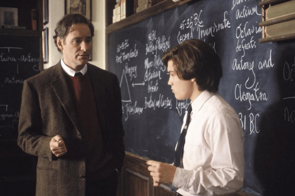 3) PROFESSOR WILLIAM HUNDERT (Kevin Kline em “O Clube do Imperador” de 2002). Espécie de “Sociedade dos Poetas Mortos” voltado para a história. Mostra o impacto da vida de um professor que acredita poder fazer a diferença na vida de seus alunos através de um concurso que explora o conteúdo histórico e filosófico da antiga Grécia, berço de nossa civilização. Kevin Kline chegou a frequentar várias aulas e a lecionar temporariamente como laboratório para o papel inspirado na vida do professor Robert Nowe, que lecionou em São Francisco e cuja trajetória foi aqui adaptada.