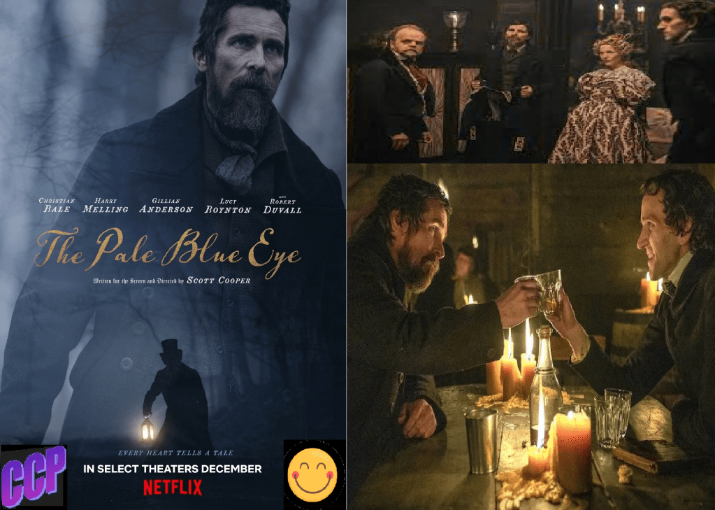 Quando assisti O Enigma da Pirâmide (1985) achei muito inventiva imaginar a juventude do icônico Sherlock Holmes, nunca explorado nos romances originais de Sir Arthur Conan Doyle. O filme O Pálido Olho Azul, adaptado do livro de Louis Baynard, explora uma premissa similar imaginando um episódio da vida do escritor norte americano Edgar Allan Poe (1809-1849). Poe realmente esteve em West Point, mas o que se segue quando entra em contato com o detetive Augustus Landor (Christian Bale) é puramente fictício. Bale é um detetive aposentado contratado para ajudar a investigar um terrível assassinato na Academia Militar dos EUA. Durante a investigação, recruta um cadete chamado Edgar Allan Poe, que o ajuda a entender o rastro de pistas que se desenrola à medida que outros mistérios surgem. Esse ritmo é gradativo na tela e permite que o roteiro construa a relação de amizade e parceria entre Landor (Bale) e Poe (Harry Melling, o Dudley da saga Harry Potter). Justamente por sua narrativa mais lenta, a história apresenta os personagens devagar e construindo o suspense à medida que a lista de suspeitos