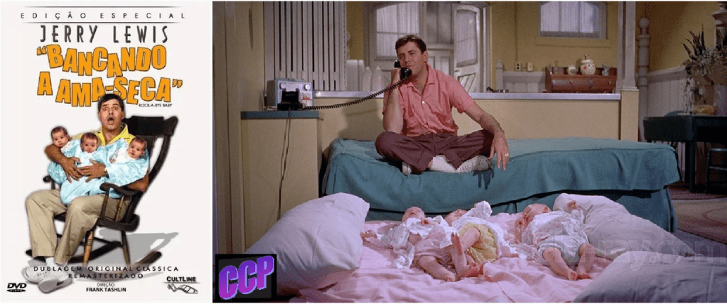 Terceiro filme de Jerry Lewis (1926-2017) sem Dean Martin (1917-1995), Bancando a Ama-Seca (Rock a Bye Baby) foi dirigido pelo mestre Frank Tashlin (1913-1973). Refilmagem livre de Papai por Acaso (1944) de Preston Sturges (1898 – 1959) com Eddie Bracken (1915-20020 e Betty Hutton (1921-2007). Na história, a atriz cinematográfica Carla Naples (Marilyn Maxwell 1921-1972) descobre estar grávida de um toureiro mexicano morto na arena logo depois de ter se casado secretamente com ela. Temendo um escândalo, Carla e seu empresário (Reginald Gardner) recorrem a um admirador de infância dela, o atrapalhado Clayton Poole (Lewis), um técnico de TV, para que cuide da criança no vilarejo onde mora, enquanto ela filma no Egito. As confusões começam quando Carla dá a luz a trigêmeos. Na sequência que mostra Clayton ainda criança, o ator que o interpreta é Gary Lewis, filho de Jerry. Este adaptou o texto ao seu estilo com gags e pequenos esquetes que nada acrescentam à história, mas mostram a capacidade de improviso e os trejeitos únicos do ator, que também ataca de cantor, interpretando Rock-a-bye baby, a canção título. (Acesse pelo link abaixo e compre seu dvd). Na semana que vem voltamos o filme A Farra dos Malandros).