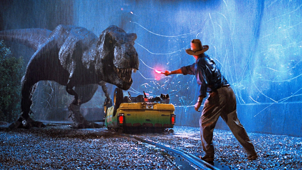 Há mais de 30 anos atrás, quando se pensava em fazer um filme com criaturas gigantescas como os dinossauros, a alternativa melhor era usar a técnica do “stop motion” ou algum outro recurso mecânico (como Bruce, o Tubarão do filme de Spielberg) para dar vida a seres que só poderiam existir na imaginação humana. O avanço no uso de modelos robóticos (animatronics) e a evolução da tecnologia digital conspirariam para assombrar o mundo com os animais pré-históricos realistas de Parque dos Dinossauros (Jurassic Park) que estreou há exatos 20 anos e agora ganha relançamento convertido para a tecnologia 3D. Em vídeo especial divulgado pelo you tube o elenco original se reuniu em celebração dos 30 anos do filme. Eficiente mistura de filme catástrofe e filme de monstro, o filme brinca com o assunto da clonagem, elemento explorado em roteiros de ficção científica, se aproveitando da curiosidade e do fascínio do público por essas ameaçadoras criaturas que um dia reinaram absolutas sobre o planeta. A princípio, o escritor Michael Crichton havia começado a desenvolver a história em 1983. Originalmente, o roteiro mostraria um pterodátilo clonado a partir de um ovo, e que levaria à recriação de outros dinos, sendo que toda a narrativa seria centrada nos olhos de uma criança. A ideia de um parque temático que fica fora do controle e ameaça seus visitantes já havia sido testada por Crichton em outro filme de sua autoria, “Westworld – Onde ninguém tem alma” de 1977. Foi necessário quase uma década para Crichton terminar seu livro, finalmente publicado em 1989 e já com os direitos de adaptação para o cinema garantidos para o Universal Studios, depois das tentativas da Warner e Columbia de negociar com o autor. Este, desde o começo desejou ter Steven Spielberg, quem já conhecia desde a época de produção de “O Enigma de Andrômeda” (1971), na cadeira de diretor do filme.