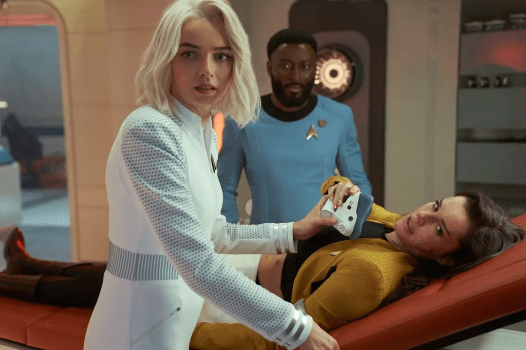 Dito isso, essa nova empreitada de STAR TREK tem como ponto de partida a convocação do Capitão Pike (magistralmente interpretado por Anson Mount) para uma missão de resgate onde já somos apresentados a uma tripulação com alguns rostos e raças familiares, bem como a novos personagens, como o Engenheiro-Chefe Hemmer (Bruce Horak) , um andoriano albino com uma peculiaridade interessante , o médico da nave, Doutor Joseph M’Benga (Babs Olusanmokun) e o sempre diligente Spock (muito bem interpretado por Ethan Peck que, vale dizer, é neto do grande Gregory Peck) e algumas outras presenças da série clássica que sofreram interessantes atualizações (como a enfermeira Christine Chapel, papel de Jess Buch) e outras relevantes e surpreendentes adições!