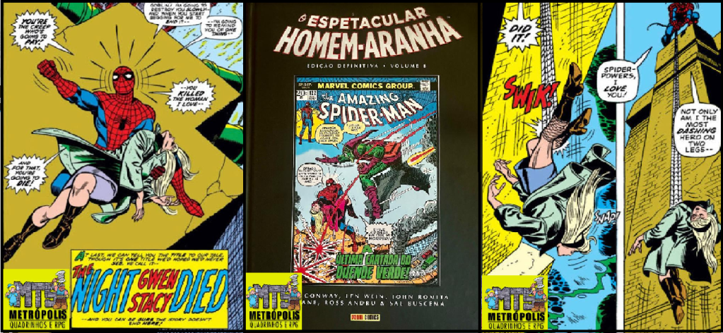 Mas não nos percamos! Em dezembro de 1986 saiu a segunda edição de MARVEL ESPECIAL com uma dramática capa desenhada pelo talentoso Watson Portela que mostrava o Aranha, Gwen Stacy caída aos seus pés e o Duende Verde alçando voo… na minha ingenuidade dos 12 anos pensei “Nossa, o Duende feriu a Gwen, mas o Aranha a salvou e vai sentar o sarrafo nele!” Sinceramente, eu nem imaginava! E comecei a ler a edição… uma história melhor que a outra, Stan Lee em sua melhor forma, e as sensacionais artes de John Romita e Gil Kane… tem até uma história com pretenso “final feliz”, que se encerra com um lindo encontro entre Peter e Gwen com uma bela cena de beijo entre os dois! Logo em seguida comecei a ler uma história na qual a primeira página NÃO mostrava seu título… a narrativa apenas falava que não havia muito a se dizer e que nem seu título poderia ser dito naquele momento! Aquilo me deixou apreensivo, e desatei a ler porque imaginava que o título (certamente algo bombástico) fosse aparecer logo em seguida; cada página mais tensa do que a outra (e nada da ¥€$$@ do título 🤬🤬)… então, o Duende sequestra Gwen Stacy. Naquele momento, meu coração já estava quase saindo pela boca e quando o Aranha vai ao encontro do Duende para salvá-la, vou percebendo que as coisas vão tomando um rumo muito diferente do que eu esperava… e cheguei ao final da história com um tremendo nó na garganta e sem acreditar no que estava lendo… no que estava constatando a cada virada de página… uma tensa batalha e um herói que falhava ao salvar uma inocente (conseguem imaginar meu choque?)… e aí eu finalmente descobri o título daquela história em sua última página com uma cena extremamente trágica e dramática: “A NOITE QUE GWEN STACY MORREU”!