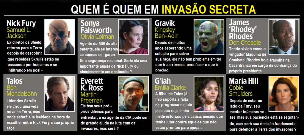 No elenco, além dos já conhecidos Samuel L. Jackson, Cobie Smulders, Don Cheadle, Martin Freeman e Ben Mendelsohn, o elenco de Invasão Secreta tem os recém chegados Olivia Colman (Meu Pai), Kingsley Ben Adir (Peaky Blinders) e Emilia Clarke (Game of Thrones) em papéis de grande importância para o desenvolvimento da trama. Depois de 32 filmes e 8 séries produzidas ao longo de 15 anos, Nick Fury está de volta aos holofotes, e o personagem mostrará novas camadas em suas motivações. O resultado todos poderemos acompanhar a partir desta quarta (21/06) no Disney Plus.
