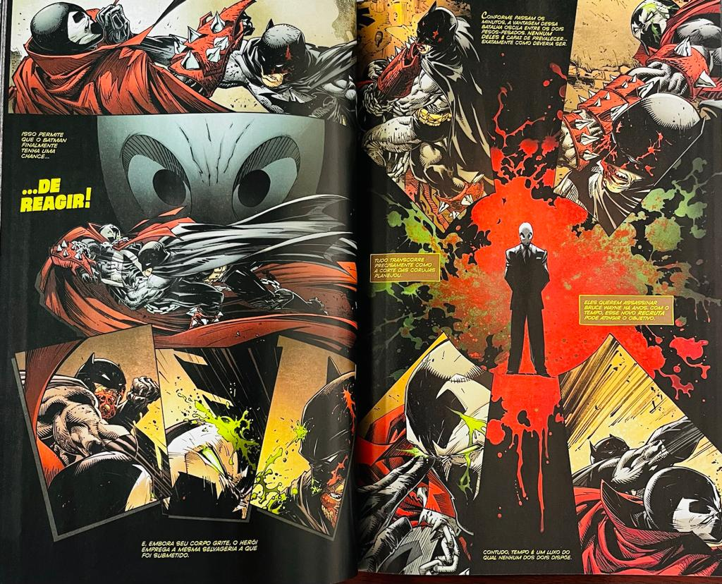 A trama gira em torno da data do aniversário da morte dos pais de Bruce Wayne, que também carrega um significado especial e tormentoso para Al Simmons (decorrente de acontecimentos mostrados em SPAWN CONTRA SATÃ, da Editora NEW ORDER). A história tem participação de membros da chamada CORTE DAS CORUJAS (um grupo cultista que age nos bastidores do poder em Gotham City), do Coringa e das hostes demoníacas que desejam cooptar a alma de SPAWN, sendo uma narrativa que envolve deslocamentos temporais e outros detalhes que é melhor não mencionar para não entregar toda a trama rasa e pretensamente épica concebida por Todd McFarlane. Sobre a arte, Greg Capullo sempre teve um estilo que me agradou pois mesmo quando passou a desenhar Spawn, com arte-final predominantemente de Danny Miki, seu estilo não se rendeu totalmente aos exageros da chamada “era Image”, mantendo um tom sombrio e um bom nível de detalhamento. No entanto, nesse novo crossover entre Batman e Spawn, o lápis de Capullo – não sei se por influência da arte-final da dupla McFarlane e Glapion ou por opção do próprio desenhista – em alguns pontos está absurdamente exagerado, chegando a retratar o Batman com proporções de halterofilista em algumas cenas e em outras mostrando-o com um pescoço alado.