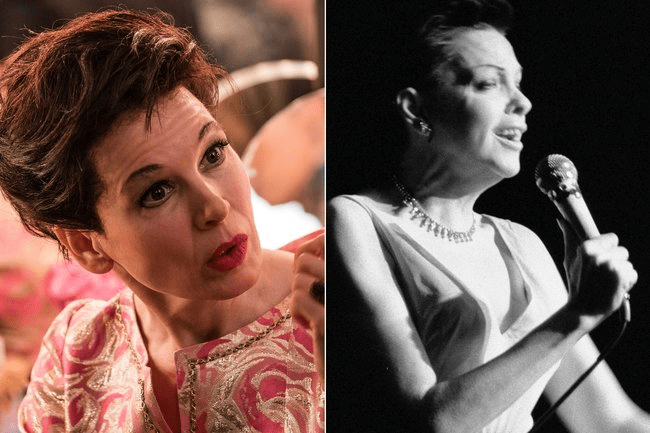 René Zellweger, de 50 anos, interpreta Judy Garland aos 47 anos, quando chega a Londres para uma série de apresentações depois de quase 5 anos sem filmar. Em Londres Judy se divorcia de seu quarto marido, depois de três anos juntos. Nesse momento, conhece o jovem Mickey Deans, que se tornaria seu quinto marido a partir de Março de 1969. Renée recria Judy Garland com forte apelo emocional, à medida que o roteiro segue os últimos meses de Judy durante sua estadia em Londres entre o final de 1968 e o início de 1969 para uma série de apresentações que se tornaria seu canto do cisne em meio a um divórcio complicado, problemas financeiros e o descaso da mesma indústria que transformou Frances Ethel Gumm em Judy Garland há mais de 30 anos antes dos eventos mostrados no filme. Junto com o filme a trilha sonora a ser lançada terá Rene Zellweger em dueto com Sam Smith, grande admirador da estrela. René passou um ano ensaiando para o papel treinando seus dotes vocais com Eric Vetro, renomado técnico vocal de estrelas como Ariana Grande e Katy Perry, que também trabalhou na produção dos sucessos Os Caminhos da Floresta (2014), La La Land (2016) e “A Bela & A Fera” (2017). Embora René já tivesse exercitado seus dotes vocais cantando e dançando no premiado Chicago (2014), viver um ícone como Judy Garland tornou-se um desafio hercúleo dada a intensidade vocal de quem marcou a história do cinema entoando e encantando gerações com “Get Happy“, do filme Casa Comida & Carinho (1952), sua despedida da MGM. De sua fase no estúdio do Leão gravou “Somewhere over the rainbow” para O Mágico de Oz em 1939, imortalizando inocência e fantasia que em nada se assemelhava as agruras do star system ao qual pertenceu. Quando filmou a segunda é melhor versão de Nasce Uma Estrela em 1954, para a Warner, uma história de ascenção e queda (recentemente reformada com Lady Gaga e Bradley Cooper) que parecia espelhar sua própria trajetória. Da trilha deste ouvimos “The Man That Got Away”, uma canção sobre abandono, sentimento que parecia acompanhar a estrela em cada um de seus cinco casamentos.