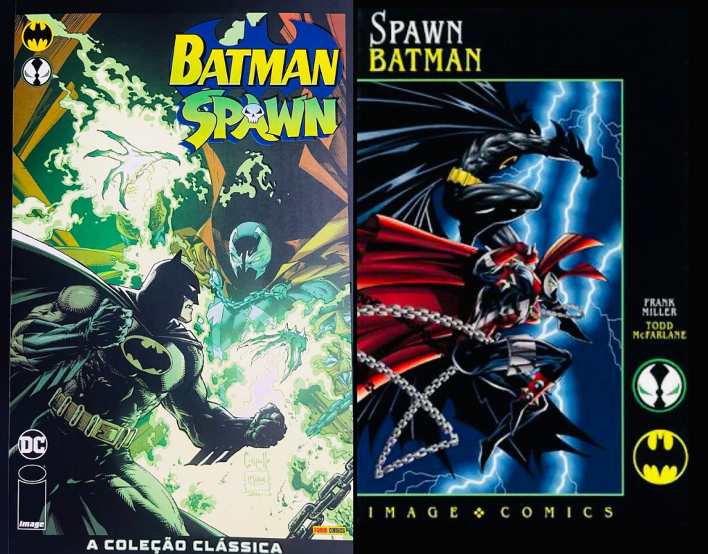 A segunda história do compilado, intitulada apenas BATMAN / SPAWN tem roteiro de FRANK MILLER e arte de TODD McFARLANE (criador do Spawn) e começa quando um rastro deixado por armas ultratecnológicas e pessoas em situação de rua leva BATMAN à cidade de Nova York onde, encontra mais uma vez O Soldado do Inferno. Dessa vez, a trama gira em torno de MARGARET LOVE, fundadora da sociedade beneficente “CURE O MUNDO” que, num dado momento lança os dois cruzados encapuzados num embate. As razões e as motivações de Love vão sendo descortinadas ao longo da trama que, também não é grande coisa, ainda que tenha sido um pouco mais bem escrita. Temos aqui Frank Miller ainda no auge do seu talento, entregando uma aventura menos calcada no sobrenatural e com um pouco mais de ação, mas nem isso foi o bastante para salvar a história. Não chega a ser intragável (particularmente acho que foi pouca coisa melhor que a primeira), mas está bem longe de ser o que esperávamos de Miller nessa época. A arte de Todd McFarlane aqui já tinha passado pelas transições que experimentara quando atuou na Marvel, em especial no título do Homem-Aranha, mas ainda que seu traço guardasse bastante do que me agradava antes, nessa história já era possível perceber que estava mais econômico em termos de detalhes e acabamento. McFarlane nunca foi um gênio narrativo, mas aqui comete alguns deslizes em várias cenas, onde retrata Spawn com máscara e sem máscara em vários quadros sequenciais. Não compromete a arte no geral mas faz pensar tipo “se quando o Batman dá um chute nas costelas do Spawn (e ele está sem máscara), na cena imediatamente seguinte, ele aparece com a máscara… que raio de magia é essa???”😝😝😝