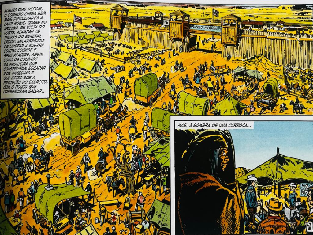 Continuação da história anterior, esta edição foi publicada na França pela primeira vez em forma de álbum em 1967, e publicada no Brasil pela primeira vez em BLUEBERRY #2, da editora Abril em novembro de 1990. Depois de descobrir quais foram os verdadeiros responsáveis pelo rapto do menino Stanton e resgatá-lo com a ajuda de Crowe, Blueberry se vê numa missão de tentar contactar o general Crook, que comanda as operações contra os apaches para informá-lo sobre a realidade dos fatos. Para tal, assume a liderança de uma escolta destinada a levar armas e munições para o citado general, tendo mais uma vez toda sua astúcia posta à prova para alcançar seu intento. Nessa edição somos apresentados ao nêmesis do tenente Blueberry nesse primeiro grande arco de histórias, que se revela uma raposa tão ardilosa e inteligente quanto nosso herói. Vale mencionar que os acontecimentos vão se desenrolando de uma forma que um quadro tenebroso começa a se desenhar no horizonte! O roteiro de JEAN-MICHEL CHARLIER é minucioso e detalhista sem ser enfadonho, entregando o que precisa no momento certo, mostrando cada vez mais a habilidade de Blueberry em contornar situações inusitadas e aparentemente sem solução, ao passo que a arte de JEAN GIRAUD nos brinda com belos quadros e sequências de tirar o fôlego. Um aviso para aqueles que nunca leram essa pérola, não esperem splash pages (ilustrações bombásticas de páginas inteiras) pois antes de serem compiladas em álbuns, as sequências eram publicadas em formato de tiras semanais, como mencionei no início. Mas não deixe que esse pequeno detalhe o impeça de conferir essa obra-prima dos quadrinhos franco-belgas.😉