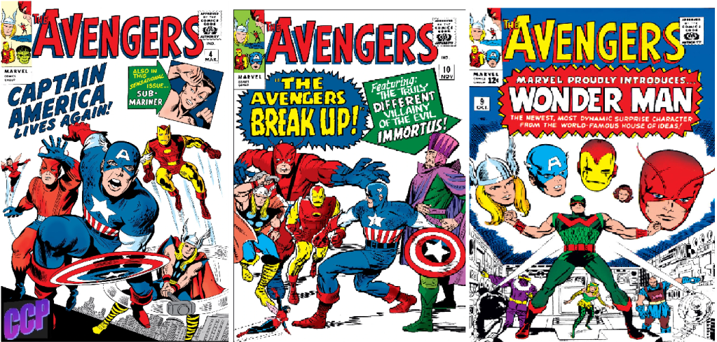 Pouco mais de um ano após a volta do Capitão América, Os Vingadores sofreram a primeira de muitas mudanças em suas fileiras. Os membros originais da equipe se retiram e deixam a cargo do Capitão recrutar novos membros. A partir da edição 16 de Avengers, a nova formação recebe os ex-vilões Feitiçeira Escarlate, Mercúrio (saído das páginas de X Men) e Gavião Arqueiro (saído das páginas de Tales of Suspense, 57, na qual enfrentou o Homem de Ferro). Essa fase, desenhada por Don Heck, foi extremamente popular no Brasil, já que muitas delas foram adaptadas para o desenho animado do Capitão América, exibido no programa do Capitão Aza na hoje extinta Tv Tupi. Os membros originais voltariam posteriormente à equipe, mas somados a eles novos e importantes personagens : Hank Pym, ex- Homem Formiga, retorna na edição 28 (1966) agora com o poder de aumentar seu tamanho e passando a se chamar Golias; o Pantera Negra (regente do fictício país Africano de Wakanda) na edição 52 (1968); o sintozóide (andróide com órgãos artificiais) Visão na edição 57 (1968) – que viria a viver um romance com a Feitiçeira Escarlate, chegando a se casarem mais tarde; a ex- espiã Viúva Negra, que surgiu pela primeira vez em uma aventura do Homem de Ferro publicada em Tales of Suspense nº 52 em 1964, entra na edição 111 (1973) entre outros. Os roteiros de várias fases dos Vingadores visitaram e revisitaram temas clássicos da fantasia e da ficção científica: Invasão Alienígena na Guerra Kree-Skrull na primeira metade dos anos 70; A criação de vida artificial que já foi explorada nos livros de Isaac Azimov aparece na história do robô Ultron, que adquire consciência própria e ódio pelos seres humanos; a chegada do semi-Deus Hércules (mitologia grega), vilões em busca do poder absoluto levando à corrupção absoluta (a saga de Thanos, a saga de Korvac) etc… A cada geração, vários artistas se destacaram nos roteiros e desenhos dos Vingadores depois da saída de Stan Lee e Jack Kirby: Roy Thomas, John Buscema, George Perez, Steve Englehart, John Byrne, Sal Buscema, e, inclusive o brasileiro Mike Deodato que no final dos anos 90 desenhou um arco tão mal recebido, no qual o Homem de Ferro torna-se um terrível vilão, que foi logo desconsiderado para efeitos de cronologia.