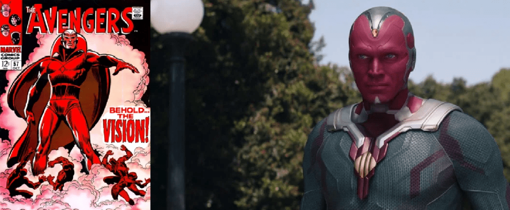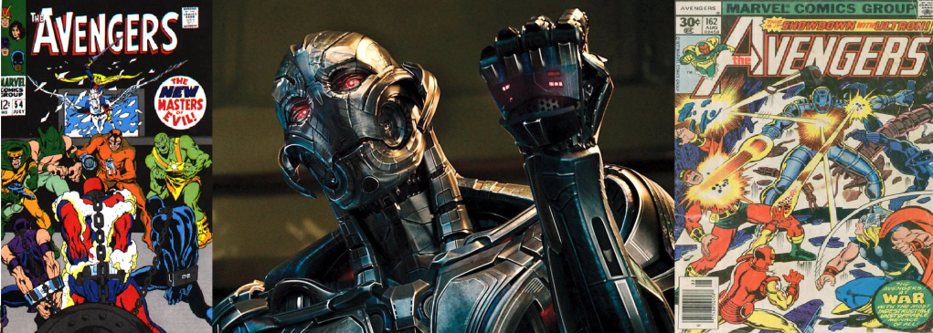 Já o androide Visão fez sua primeira aparição em Avengers #57 (outubro de 1968) e sua origem foi inicialmente um mistério até ser revelado que este foi criado pelo robô Ultron para se infiltrar na equipe e matá-los, diferente do filme que mostra o Visão como uma criação de Tony Stark utilizando o programa de inteligência artificial jarvis (que no original das HQs é um mordomo humano) com forma corpórea. Essa é uma entre outras diferenças entre filme e HQ: O vilão que se torna o catalisador de toda a ação do filme originalmente foi criação do cientista Dr.Henry Pym, identidade secreta do Homem Formiga (herói que ganha em breve filme solo, mas não participa da formação dos vingadores no filme), que criou uma inteligência artificial tão perfeita que acredita que só haverá ordem no mundo se exterminar as formas de vida baseadas em carbono, ou seja, os humanos. Roy Thomas e John Buscema, escritor e desenhista do título na época, buscou inspiração no mito Frankensteniano, mas subvertendo as leis da robótica escritas por Issac Azimov, e que já geraram incontáveis histórias na literatura e no cinema. Em “Avengers #54” (Julho de 1968)o robô Ultron só mostra sua cara no final da história depois de manipular outros vilões a atacar os vingadores, voltando na edição seguinte ainda sem que sua origem seja explicada, o que ocorreria mais tarde. Roy Thomas acrescentou então um ingrediente novo ao vilão: um incontrolável desejo de matar seu criador deixando a mostra um indisfarçável complexo de Édipo que o levou, inclusive a sequestrar Janet, a esposa de Henry Pym, logo sua “mãe” e usar seus padrões mentais para criar uma companheira, a robô Jocasta (Avengers # 170 de abril de 1978) já com os roteiros de Jim Shooter e os desenhos de George Perez no título dos heróis. No filme Ultron tem origem diferente, mas a mesma diretriz destrutiva capaz de ameaçar a presença humana no planeta e ganha a voz poderosa de James Spader. Sua fala, divulgada no trailler, “There are no strings on me” (Não há cordas em mim) faz citação ao clássico “Pinóquio” e provoca o delírio dos leitores que verão no filme um conflito em dimensão de videogame, que tem a função de encerrar a fase 2 da Marvel e plantar as sementes que conduzirão a Capitão America 3 – Guerra Civil , que viria no ano seguinte.