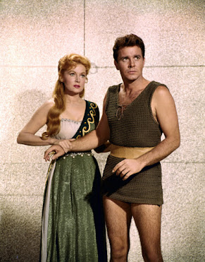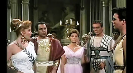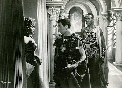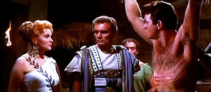 Rhonda Fleming uma radiosa patrícia romana. Lang Jeffies, um ator inexpressivo,
