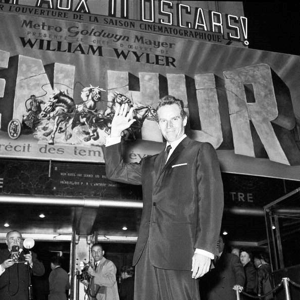 | Charlton Heston colhendo os louros em Cannes para a exibição de BEN-HUR. |