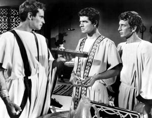 | Charlton Heston, Stephen Boyd, e Terence Longdon, em cena de BEN-HUR, 1959. |
