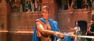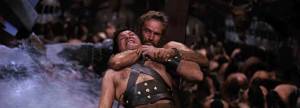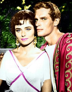 | Ben-Hur com sua amada romana Flávia (vivida pela italiana Marina Berti). Um breve relacionamento em Roma, não muito explorado na obra de Wyler. |
