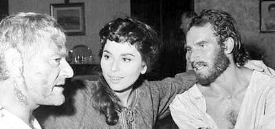 | Jack Hawkins, Haya Harareet, e Charlton Heston, em intervalo de filmagem. |