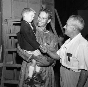 | Charlton Heston carregando o filho Fraser, que cumprimenta William Wyler, numa pausa das filmagens. |