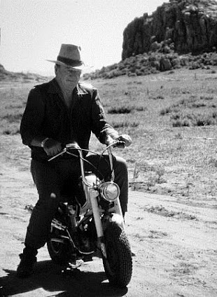 Por breves momentos, o Duke aposentou o cavalo e aderiu à uma motocicleta, em uma folga das filmagens de JAKE GRANDÃO.