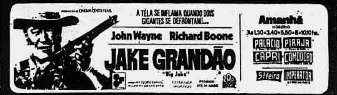 Considerado o mais animado e genuíno Western dentre os quais estrelou, John Wayne (1907-1979), após sua conquista com o Oscar de melhor ator no ano anterior por Bravura Indômita, optou por fazer uma espécie de homenagem ao bom e velho estilo de seu compadre e amigo, o Mestre John Ford (1895-1973), ao estrelar JAKE GRANDÃO (Big Jake), em 1971. Muito mais superior do que Jamais Foram Vencidos (1969), Chisum (1970) e Rio Lobo (1971), a aventura da vez ancorada pelo Duke é traçada em linha reta e cheia de ação, contagiada por bom humor e às vezes por lirismo rústico, bem aos moldes dos grandes trabalhos do diretor Ford. E o melhor de tudo isso, é que Jake Grandão tem, de fato, o clima festivo que tão bem caracterizou o trabalho deste cineasta, como se fosse uma “reunião de família”, tirando férias em passagem pelo México (onde o filme foi inteiramente rodado).