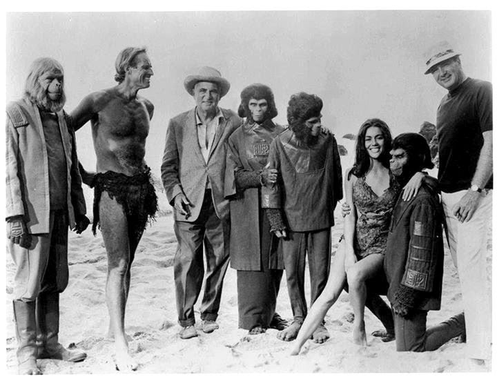 | Os astros Maurice Evans, Charlton Heston, Kim Hunter, Linda Harrison (sentada na perna de Roddy McDowall), e membros da equipe técnica |