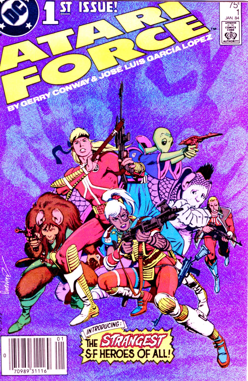 Era o ano de 1984 e a ao chegar em uma banca de jornal encontrei três revistas que chamaram minha atenção: Super-Homem, Batman e Heróis Em Ação. Logo segunda edição desta última conheci uma equipe futurista que adorei de cara. Era o Esquadrão Atari com os desenhos maravilhosos de José Luiz Garcia Lopez, espanhol radicado na Argentina. Eu não sabia então mas haviam duas séries de quadrinhos com o Esquadrão Atari, ambas publicadas pela DC Comics, de 1982 a 1986. Ambas resultado da parceria firmada entre a editora e a popular empresa Atari Inc, um marco dos anos 80. Lopez havia ilustrado várias histórias da Mulher Maravilha, Superman e outros nos anos 70. Seu traço elegante e arrojado confere expressão facial e movimentação de admirável leveza e naturalidade para os personagens. A primeira versão da equipe foi uma inteligente jogada de marketing na qual comprava-se um cartucho do Atari e ganhava-se como brinde uma revista com as aventuras de uma equipe de viajantes espaciais encarregados de encontrar um novo lar para a humanidade depois que um desastre ambiental sem precedentes ameaça o futuro da espécie humana. A.T.A.R.I. torna-se então a sigla para Advanced Technology and Research Institute ou Instituto de Pesquisa e Tecnologia Avançada, e a equipe composta por Martin Champion (comandante da missão), sua esposa Lydia Perez, Li-San O’Rourke, Oficial de Segurança, Mohandas Singh, Engenheiro de Voo e do Oficial Médico Dr. Lucas Orion que usam a nave multidimensional Scanner One capaz de navegar pelo Multiverso, um conceito popular atualmente. O roteiro desta série inicial foi de Gerry Conway e Roy Thomas com desenhos de Ross Andru, Gil Kane, Dick Giordano e Mike DeCarlo.