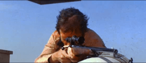 um franco-atirador ameaça disparar seu fuzil de mira telescópica sobre um alvo