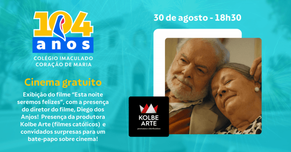 O Colégio Imaculado Coração de Maria vem há três anos trabalhando com o cinema como eletiva para turmas do 1º e 2 º ano do ensino médio. Para comemorar os 104 anos da instituição, esta celebrará a data com um evento especial nesta sexta (30/8) a partira das 18:30 com a exibição do curta Esta Noite Seremos Felizes, dirigido por Diego dos Anjos e estrelado por Othon Bastos e Bete Mendes, e que foi exibido com sucesso no circuito dos festivais, sendo devidamente premiado recentemente no 10º Santos Film Fest. A exibição será seguida de uma mesa redonda composta por Diego do Anjos, os atores e dubladores Evie Saide e Gustavo Nader, além de representante da distribuidora Kolbe Arte. Entre os assuntos tratados no bate papo estarão os caminhos profissionalizantes do cinema no país, o movimento Dublagem Viva entre outros. O Colégio Imaculado Coração de Maria fica na rua Aristides Caire 141, Meier.