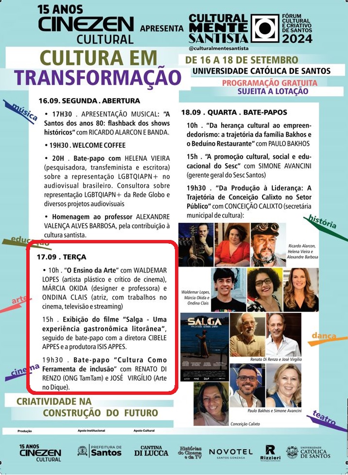 O Culturalmente Santista – Fórum Cultural e Criativo de Santos, consolidado no calendário oficial da cidade desde 2012, retorna em 2024 com uma programação diversa e focada na promoção de reflexões sobre o momento atual da cultura na região e no país. O evento, realizado pelo Instituto CineZen Cultural, coordenado pelos produtores André e Paula Azenha, ocorrerá entre os dias 16 e 18 de setembro na Universidade Católica de Santos (UniSantos, Av. Conselheiro Nébias, 300). O tema desta edição é “Cultura em Transformação: Criatividade na Construção do Futuro”.