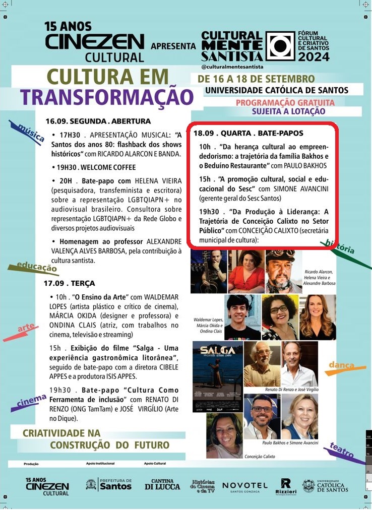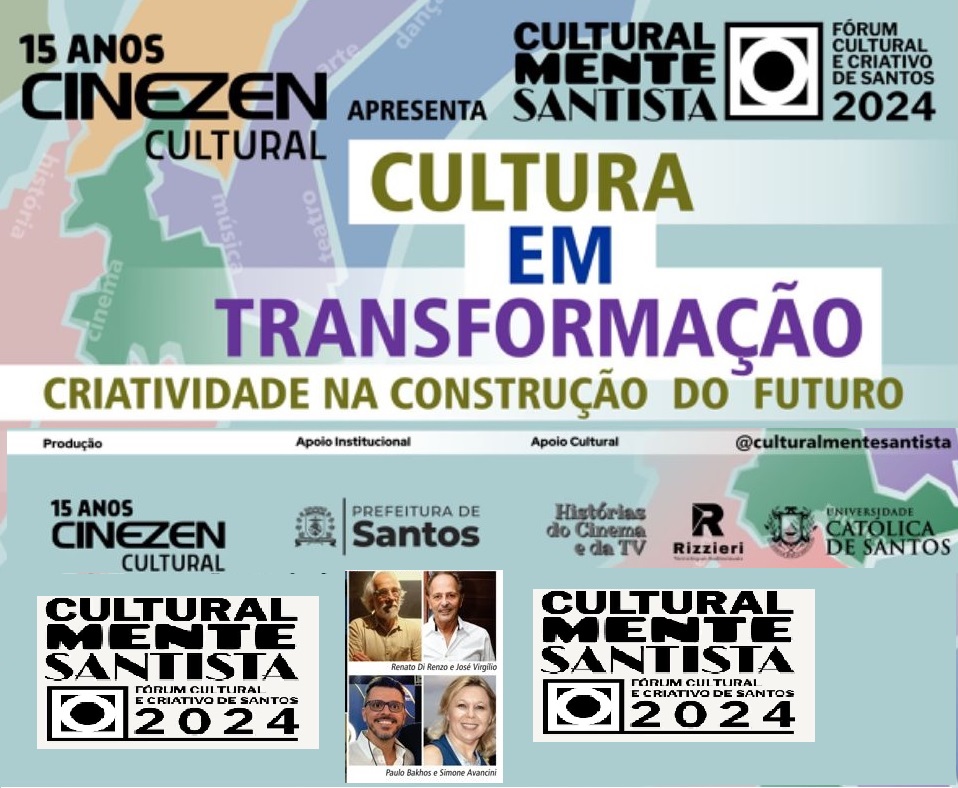 O Culturalmente Santista – Fórum Cultural e Criativo de Santos, consolidado no calendário oficial da cidade desde 2012, retorna em 2024 com uma programação diversa e focada na promoção de reflexões sobre o momento atual da cultura na região e no país. O evento, realizado pelo Instituto CineZen Cultural, coordenado pelos produtores André e Paula Azenha, ocorrerá entre os dias 16 e 18 de setembro na Universidade Católica de Santos (UniSantos, Av. Conselheiro Nébias, 300). O tema desta edição é “Cultura em Transformação: Criatividade na Construção do Futuro”.