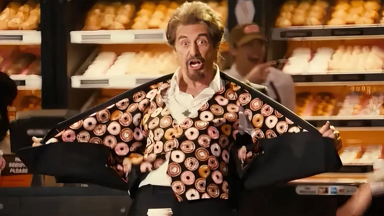 Cada Um Tem a Gêmea Que Merece (Jack and Jill) é o filme de Al Pacino com a classificação mais baixa, com míseros 3% no Rotten Tomatoes. A única conquista do filme foi ganhar todas as 12 indicações ao Framboesa de Ouro como Pior Filme, Pior Diretor, Pior Ator, Pior Atriz (com Adam Sandler ganhando por ambos) e Pior Roteiro. Sandler interpreta Jack, um executivo de publicidade, e sua irmã gêmea Jill, que é o pior dos estereótipos judaicos: uma chata detestável, neurótica e chorona. O filme é bem sem graça com inúmeras piadas transfóbicas sobre sua aparência masculina, ou gordofóbicas sobre ela ser pesada demais para um pônei que despenca. No entanto, o filme tem seus momentos e quem é o roteirista não creditado Robert Smigel que introduziu uma história com Al Pacino, aquela em que este se apaixona por Jill, e assim Jack o convence a participar de um comercial da Dunkin’ Donuts em troca de conhecer Jill, apesar do desinteresse dela. O desempenho genuinamente apaixonado de Al Pacino é o que salva Cada Um Tem a Gêmea Que Merece de ser completamente terrível. Sua atuação faz com que o humor venha de sua dedicação e obsessão por Jill. Pacino poderia muito bem estar interpretando Ricardo III de Shakespeare, pela maneira como ele se concentra em Jill e fala sobre ela com tanta eloquência romântica, comparando-a à Dulcineia de Dom Quixote ou observando com melancolia: “Sua irmã e eu crescemos nas mesmas ruas. Quando olho para ela, eu me vejo”. Mas a melhor piada de todas acontece quando Jill acidentalmente quebra o Oscar dele. Ela exclama: “Oh, meu Deus! Sinto muito! Mas tenho certeza de que você tem outros”. A resposta dele, “É de se esperar que sim, mas, estranhamente, não tenho”, é um comentário inestimável sobre sua desconcertante falta de reconhecimento em premiações. A parte mais divertida mesmo é o comercial do Dunkaccino, que se tornou um meme na Internet. Usando um terno com fotos de donuts no forro interno, Al Pacino canta seus bordões mais famosos e mexe os pés como uma criança superexcitada para promover o Dunkaccino – uma mistura de café e chocolate quente. Na cena final, quando ele diz a Jack para queimar o comercial e destruir todas as cópias, o filme nos deixa saber que Al Pacino, o ator, está muito envolvido na brincadeira. Ele sabe que, na vida real, isso seria um golpe baixo e totalmente embaraçoso. O lendário ator de O Poderoso Chefão disse em uma entrevista ao The New York Times por que aceitou o papel: