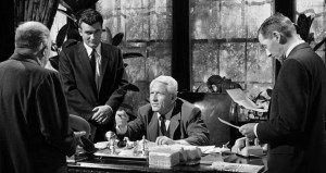 Adam (Jeffrey Hunter) e Sam Weinberg (Ricardo Cortez) acompanham a apuração da eleição…