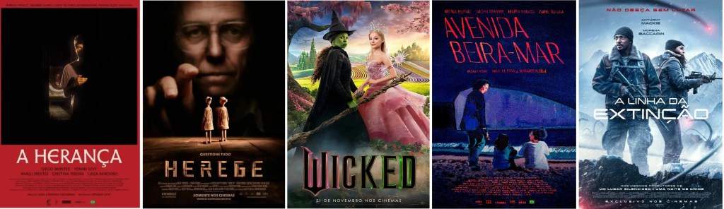WICKED (Wicked) EUA 24. Dir: John M. Chu. Com Cynthia Erivo, Ariana Grande, Jeff Goldblum, Michelle Yeoh, Jonathan Bailey, Ethan Slater, Adam James. Musical. Adaptação muito aguardada de musical da Broadway, que reimagina o clássico O Mágico de Oz a partir da ligação entre Elphaba (Erivo), a bruxa má do oeste e Glinda (Grande),a fada. Toda a história se desenrola antes da chegada de Dorothy, ou seja, serve de prólogo para os eventos do clássico livro de L. Frank Baum, levado às telas com Judy Garland em 1939. Do mesmo diretor de Truque de Mestre: O 2º Ato (2016) e Podres de Ricos (2018), o filme mostra como as duas personagens iniciam uma improvável amizade apesar das diferenças na Universidade de Shiz, em Oz levando-as a um encontro com o Mágico de Oz (Goldblum). No livro original, publicado pela primeira vez em 1900, a Bruxa Má do Oeste não é verde e não tem nome. Elphaba foi usado juntando as iniciais do autor o livro original L. Frank Baum. A pele verde foi originalmente concebida para o filme de 1939, do qual o autor Gregory Maguire escolheu derivar a sua própria obra literária. Wicked é uma das muitas adaptações do mundo de ‘Oz’ que incorporaram o aspecto da pele verde, como Era Uma Vez (2011) e Oz: Mágico e Poderoso (2013). O filme foi dividido em duas partes, com a segunda chegando em 21 de novembro de 2025.