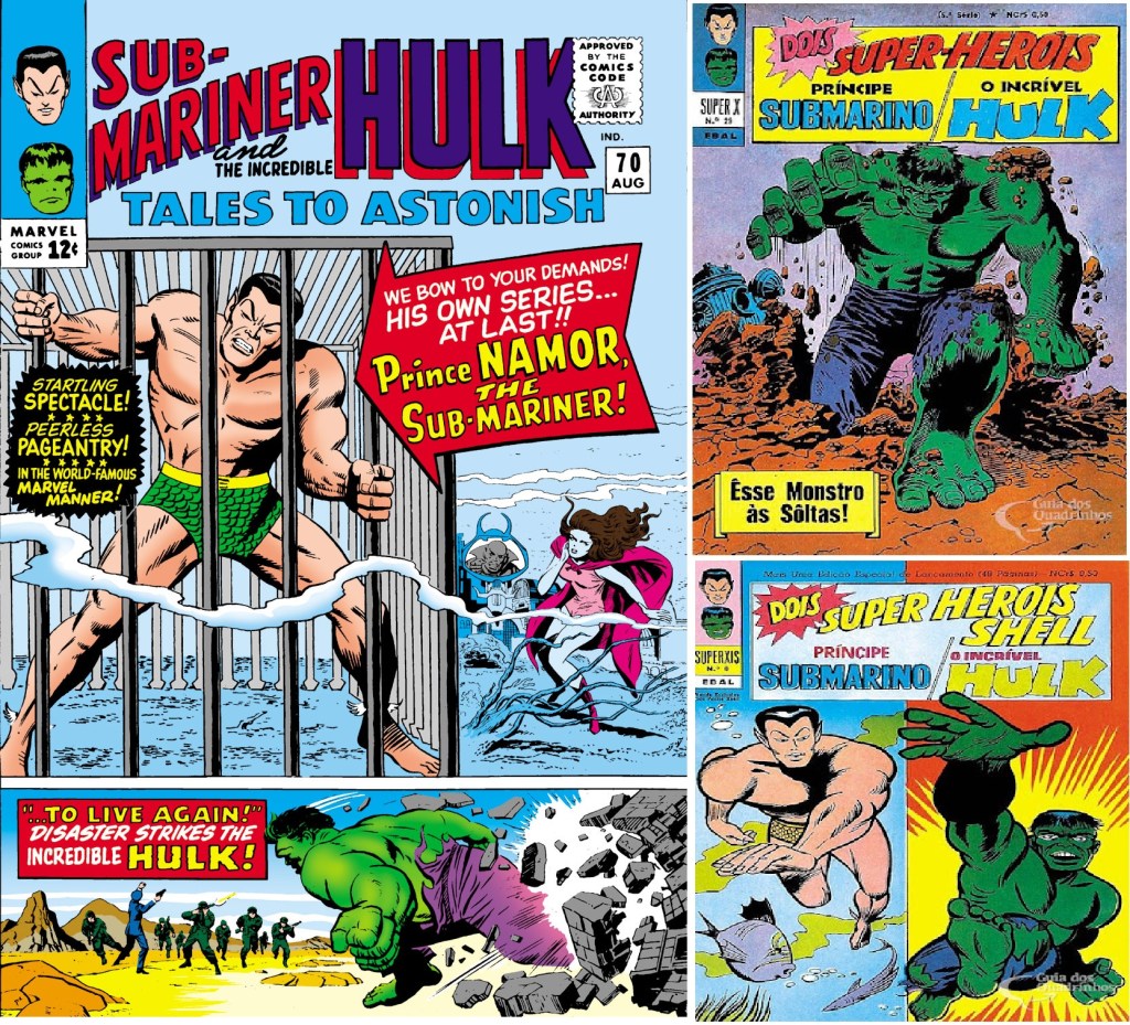 Vale mencionar que esta história publicada em TALES TO ASTONISH #70, escrita por STAN LEE, com desenhos de JACK KIRBY e arte-final de MIKE ESPOSITO (creditado como MICKEY DEMEO) foi a PRIMEIRA HISTÓRIA DO HULK PUBLICADA NO BRASIL pela Editora Brasil-América (EBAL) na revista O PRÍNCIPE SUBMARINO E O INCRÍVEL HULK (SUPER X) #0, em agosto de 1967. A título de (mais uma) curiosidade, além do papel jornal de baixa qualidade e pelas limitações técnicas da época, a revista também era publicada em preto-e-branco, tendo apenas o HULK colorizado em verde (ao menos neste primeiro número, para mostrar essa característica tão singular do personagem). Ainda falaremos sobre as publicações da EBAL no Brasil (seus acertos e inúmeros erros) em outro momento.