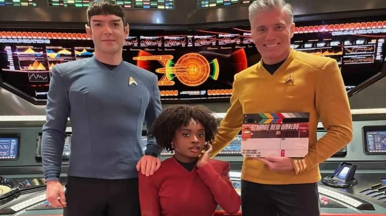 A terceira temporada de Star Trek: Strange New Worlds está programada para estrear em 2025, embora ainda não tenha sido informada uma data de lançamento real. A Paramount já divulgou várias fotos da produção da terceira temporada, bem como uma prévia completa, e os fãs de Jornada nas Estrelas ficaram encantados com algumas das histórias que estão por vir. Parece que vários dos personagens principais da série serão, em pelo menos um episódio, transformados em vulcanos, e alguns fãs mais exigentes estão esperando para ver a enfermeira Chapel (Jess Bush) finalmente conhecer o Dr. Roger Korby, um personagem que não é visto desde a série original (quando foi interpretado por Michael Strong). A série provou ser tão popular na Paramount+ que uma quarta temporada foi anunciada pela Variety em abril de 2024. Desde a última segunda (03/03), a produção da quarta temporada de Strange New Worlds começou oficialmente, de acordo com uma postagem na conta oficial de Star Trek no Instagram. Os fãs agora podem ver uma foto dos bastidores das estrelas de Strange New Worlds, Ethan Peck, Celia Rose Gooding e Anson Mount – que interpretam Spock, Uhura e Capitão Pike, respectivamente – na ponte da USS Enterprise. O mais impressionante é que Gooding está usando um novo penteado, indicando a passagem do tempo. Nas temporadas anteriores, Uhura usava um corte de cabelo curto, enquanto na nova foto ele está mais longo e estiloso. Mount também está segurando o claquete, embora as informações usuais escritas nele (o diretor, o título do episódio, etc.) estejam ausentes. A produção está, naturalmente, em segredo. Os fãs, no entanto, podem aguardar a quarta temporada, que está sendo filmada neste momento.