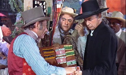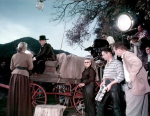 | O diretor Wyler (de óculos escuros) supervisionando uma cena com Cooper em SUBLIME TENTAÇÃO (1956) |