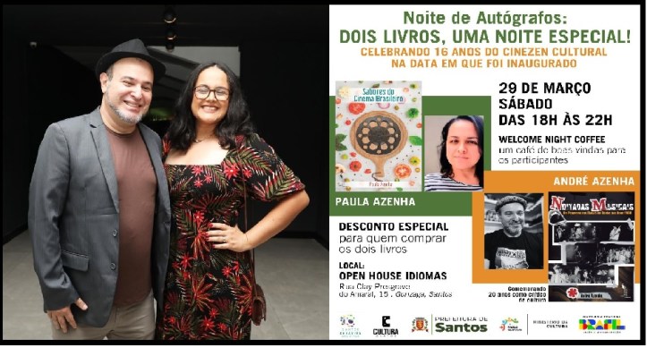 Os produtores culturais Paula e André Azenha lançam dois livros neste sábado (29/03) respectivamente sobre culinária no cinema brasileiro e shows em Santos nos anos 2000. O lançamento conjunto das 18h às 22h, na Open House Idiomas, no Gonzaga, celebra os 16 anos do Instituto CineZen Cultural e os 20 anos de trajetória de André como crítico cultural. A noite contará com um Welcome Night Coffee para recepcionar o público e desconto especial para quem adquirir os dois livros.