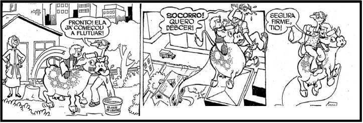 Quando garoto, devia ter uns 6 ou 7 anos lembro que adorava a hq, hoje esquecida, A Vaca Voadora, publicada pela RGE entre janeiro de 1977 e outubro de 1977. Inspirada na série de livros da Autora Brasileira Edy Lima, as histórias em quadrinhos da Vaca Voadora foram desenvolvidas pela equipe que contava com Milton Sardella (desenhos) e Sandra Siqueira (roteiros). A personagem título era uma vaca como todas as outras, mas que por conta de um elixir mágico conseguia voar. Ela vivia em um sítio no interior, que pertencia a duas senhoras. Uma delas, a Tia Quiquinha, uma estudiosa de conhecimentos científicos antigos que dominava a alquimia, era capaz de transformar ovos comuns em ovos de ouro e de conversar com gnomos. Um dia Lalau, o sobrinho da Tia Maricotinha e Tia Quiquinha, foi morar com elas, o que levou a vaca a beber o tal de elixir de levitar da Tia Quiquinha, e que causaria uma série de confusões. Entre os personagens também apareciam o Tio Gumercindo e e Aniceta, seu grande amor. Na época do lançamento de A Vaca Voadora, a RGE era uma das grandes editoras a competir no mercado de quadrinhos, publicando heróis como Fantasma e Mandrake ou personagens como Riquinho, Bolota e Recruta Zero. A editora, de propriedade da família Marinho (da Rede Globo), buscava abrir espaço entre os segmentos do mercado e abriu uma divisão de quadrinhos nacionais, o Estúdio RGE, comprometido em lançar personagens brasileiros em meio aos populares personagens estrangeiros que vendiam como água.
