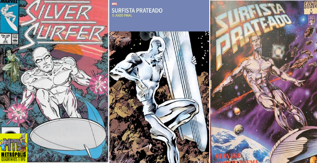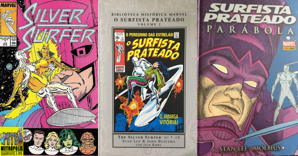 Aqui no Brasil boa parte dessas histórias foram publicadas de forma esparsa pelas editoras RGE e Abril, mas saíram compiladas integralmente nas belas edições de BIBLIOTECA HISTÓRICA MARVEL – SURFISTA PRATEADO volumes 1 e 2 . A partir da década de 1970, Stan Lee foi se afastando gradativamente da produção de histórias em quadrinhos para se dedicar à função de publisher da Marvel e a outros compromissos externos que ocupavam boa parte de seu tempo! Ainda assim, o Surfista Prateado permaneceu como sendo um de seus personagens favoritos de tal forma que Stan sempre se opunha à criação de um novo título do personagem porque ele não tinha mais tempo de escrever suas histórias! Mas essa resistência acabou arrefecendo com o passar do tempo e um novo título bem longevo do Surfista surgiu na segunda metade da década de 1980 com uma competente equipe criativa que produziu ótimas histórias! No entanto isso não quer dizer que Stan Lee não voltou a trabalhar com um de seus mais adorados personagens! Antes de encerrar esse post podemos destacar dois grandes e marcantes momentos do Surfista Prateado em histórias fechadas! Um deles é a sensacional PARÁBOLA, na qual Stan Lee se junta ao sensacional MOEBIUS, lenda francesa dos quadrinhos europeus, para nos brindar com aquela que considero como sendo A MELHOR HISTÓRIA produzida por Stanley Martin Lieber! Seu roteiro crítico e reflexivo aliado à soberba e incomparável arte de Moebius nos dão uma história que nos faz refletir sobre vários aspectos da miséria humana e do fanatismo religioso como instrumento de manipulação das massas! Uma trama que merece ser conhecida e apreciada várias e várias vezes! Essa história foi publicada pela primeira vez no Brasil pela editora Abril em 1989 e republicada em 2019 pela Panini Comics! Por fim, outro momento memorável é a graphic novel O JUÍZO FINAL, que surgiu a partir de uma ideia de John Buscema (que também amava o personagem, apesar de não gostar de quadrinhos, mas não falaremos disso agora, ok?) e Tom DeFalco, que envolvia o Surfista Prateado, Galactus e sua arauto Nova e o demoníaco Mefisto numa trama em que cada quadro era uma obra de arte de página inteira ilustrada por Buscema! Stan Lee revelou que ao escrever o roteiro dessa magnífica história se condoía ao elaborar a diagramação para os textos e os balões nas páginas com as belas ilustrações de Buscema! Essa história também foi publicada pela primeira vez no Brasil pela Editora Abril em 1991 e relançada recentemente pela editora Panini Comics em um formato diferenciado que valoriza ainda mais a arte de John Buscema! O preço está salgado, mas não é nada que uma bela promoção ou um bom cupom de desconto não resolvam! Vale a pena!