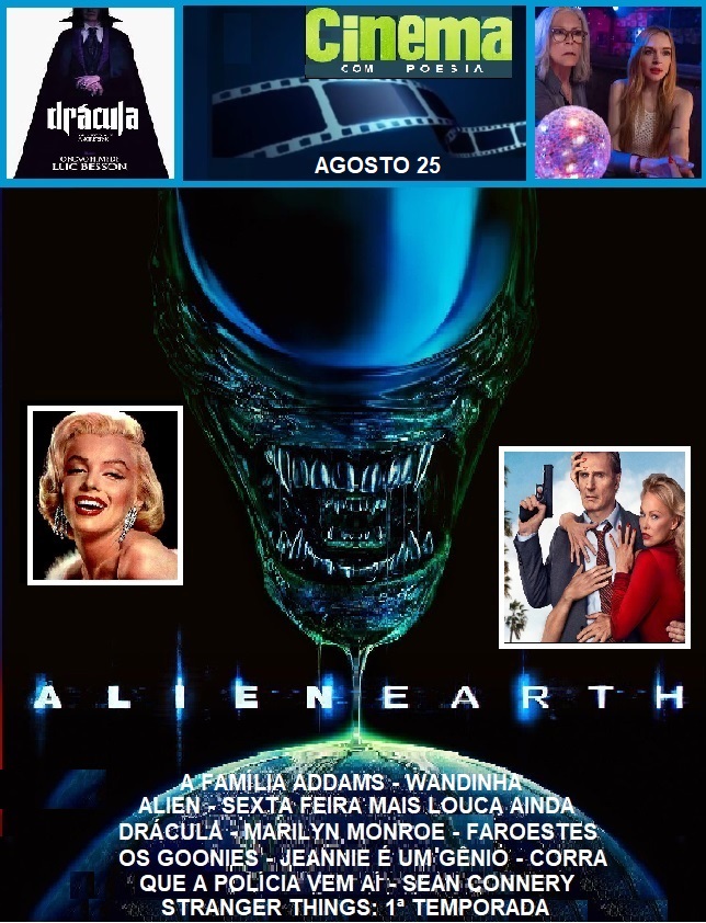 Agosto chega anunciando um segundo semestre recheado de estreias nas salas de cinema e no streaming. Para começar Alien: Terra estará na Disney + a partir de 12 de agosto cumprindo a expectativa de mostrar a chegada do xenomorfo ao planeta depois de vários filmes encenados no espaço. Vamos aproveitar e resenhar todos os filmes da franquia. Falando em franquias temos nos cinemas este mês a estreia de Corra que a Polícia Vem Aí com Liam Neeson gerando muita curiosidade se ele poderá provocar o mesmo timing cômico que Leslie Nielsen há 37anos. O mês ainda tem o aguardado Sexta Feita Mais Louca Ainda, reunindo Jamie Lee Curtis e Lindsay Lohan, a nova adaptação de Drácula por Luc Besson e mais. No streaming teremos a 2ª temporada de Wandinha, oportunidade de lembrar as outras encarnações da Família Addams, na telinha e na telona. Começando contagem regressiva para a temporada final de Stranger Things na Netflix vamos rever mês a mês as curiosidades e bastidores de cada temporada, começando a partir desse mês. Agosto inauguramos o ciclo de matérias de faroeste, revendo os grandes clássicos do gênero um a um. Sergio Cortez nos lembrará de Belchior, da era dos video cassetes e da série O Homem de Seis Milhões de Dolares. Temos homenagem a grandes estrelas do cinema como Marilyn Monroe, Sean Connery e Robert Taylor. Comemoramos os 60 anos de Jeannie é um Gênio e os 40 anos de Os Goonies. E ainda você lera a entrevista com a atriz Nina de Padua, que intwrpreta a iconica Bette Davis no teatro. Preparem-se pois o mês tem muito mais ainda aqui no cinemacompoesia, o site que une o clássico e o contemporâneo.