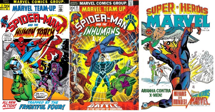 Mesmo a Ebal publicou algumas histórias esporadicamente como o encontro do Aranha com o Visão desenhado por Gil Kane em Marvel Team-Up # 5 (novembro de 1972) publicad9 pela primeira vez no Brasil em Almanaque do Homem Aranha 1974 (Ebal) e republicado em Super Almanaque do Aranha # 1 (RGE) em março de 1980. A partir de 1973 a Marvel Team-Up passou a ser mensal nos Estados Unidos e várias desses edições ganhavam espaço aleatório nas edições da Ebal, RGE e Abril, algumas das quais eram histórias de alta qualidade em termos de ação e drama como o primeiro encontro entre o Homem Aranha e o Homem de Ferro (Marvel Team-Up #9, Maio de 1973), Homem Aranha e o Capitão América (Marvel Team-Up #13, setembro de 1973), Homem Aranha, Vespa e Jaqueta Amarela com desenhos de John Byrne (Marvel Team-Up # 59 (julho de 1977) entre outras. Na época John Byrne ganhava destaque ao lado de Chris Claremont no título mensal The Uncanny X-Men e a Marvel aproveitava o traço do artista com outros personagens Outro nome iconico que chamou a atenção nas páginas da revista foi Frank Miller que desenhou o encontro do Homem Aranha com o Quarteto Fantástico (Marvel Team-Up # 100, dezembro de 1980). Durante uma década e meia a Marvel Team-Up publicou grandes encontros com poucas edições em que o Homem Aranha não aparecesse, sendo enfim cancelado em Marvel Team-Up #150 (fevereiro de 1985).