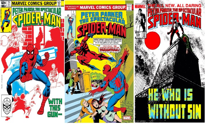 O amigão da vizinhança ganharia ainda um terceiro título chamado de Peter Parker : The Spectacular Spider-Man a partir de dezembro de 1976 trazendo inicialmente Gerry Conway e Sal Buscema. A ideia era que a revista publicasse arcos curtos mas respeitando The Amazing Spider Man como cronologia principal. A RGE trouxe o título ao Brasil pela primeira vez nas páginas de Super-Herois Marvel #25 (julho de 1981). Foi nesse título que surgiu o vilão Carniça, que depois é revelado como sendo um clone degenerado do vilão Chacal, criação de Bill Mantlo e Frank Miller publicado pela primeira vez em Peter Parker : The Spectacular Spider Man # 28 (março de 1979) e no Brasil pela primeira vez em Almanaque do Homem Aranha # 12 RGE (novembro de 1982). Outra história de grande impacto foi a morte de Jean Dewolf e o surgimento do vilão Devorador de Pecados a partir de Peter Parker : The Spectacular Spider Man # 107 escrito e desenhado respectivamente por Peter David e Rick Buckler e publicado no Brasil pela primeira vez nas páginas de Homem Aranha # 87 da Editora Abril. (Setembro de 1990). A partir de janeiro de 1988 o título é rebatizado para The Spectacular Spider-Man e com sua continuidade seguindo em paralelo aos eventos mostrados nos outros títulos do herói como The Amazing Spider Man e Web Of Spider Man, cada vez mais entrelaçados com a Saga do Clone, mas isso já é outra história da qual falaremos em breve aqui.
