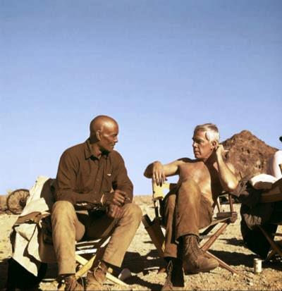 Woody Strode e Lee Marvin conversam durante uma folga das filmagens.