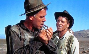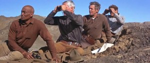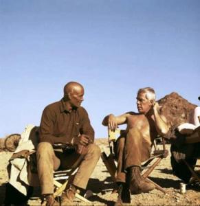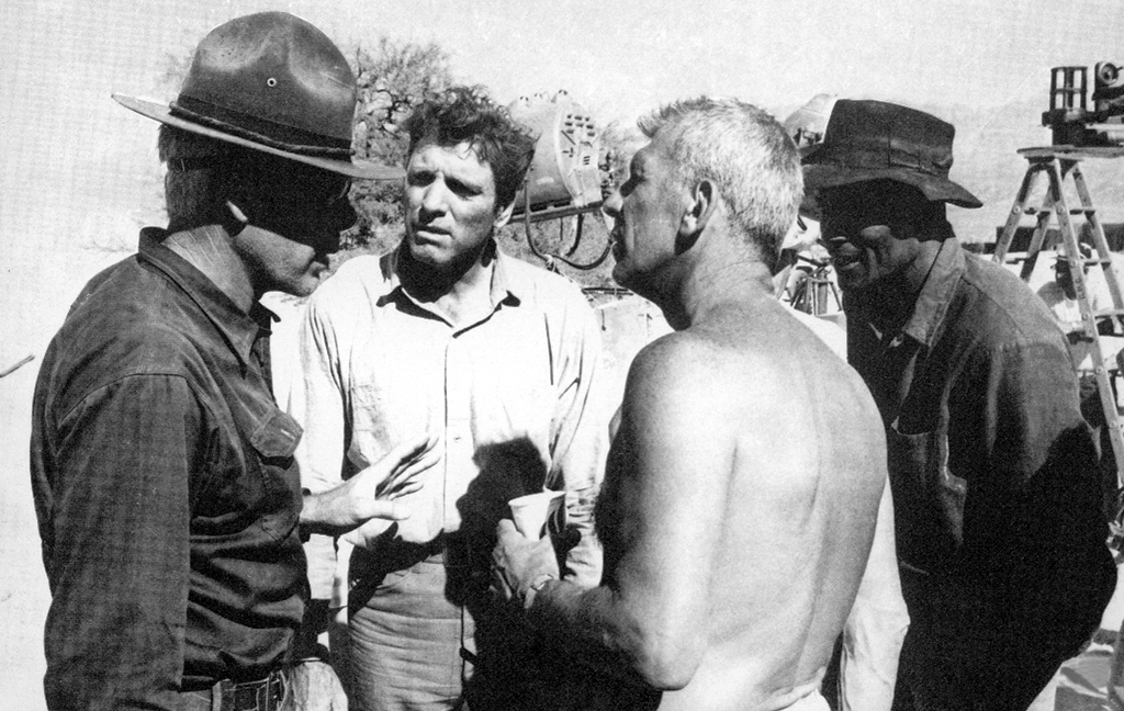 O Cineasta Brooks, sem camisa, conversando com Lee Marvin, sob os olhares de Burt Lancaster e Woody Strode, num intervalo das filmagens.