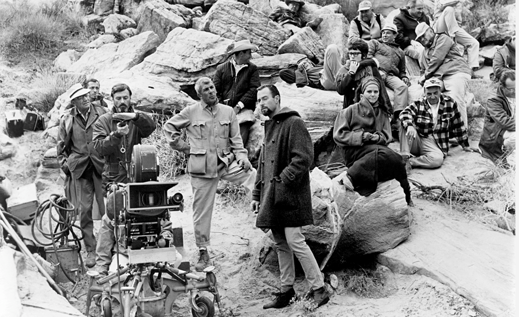 O diretor Richard Brooks, de branco, com sua equipe nas locações de OS PROFISSIONAIS, no México