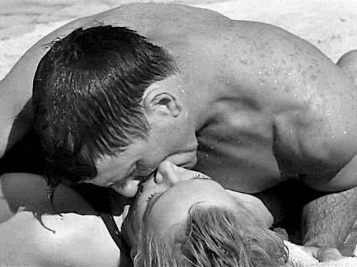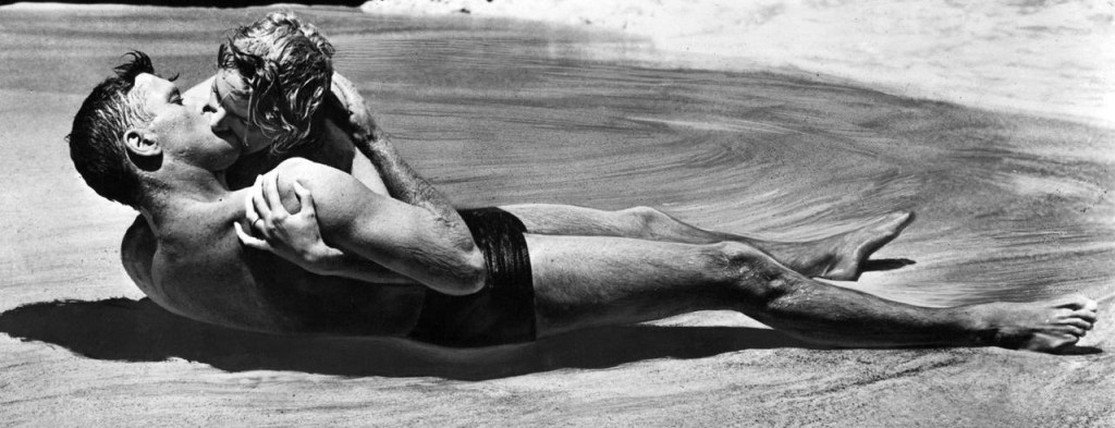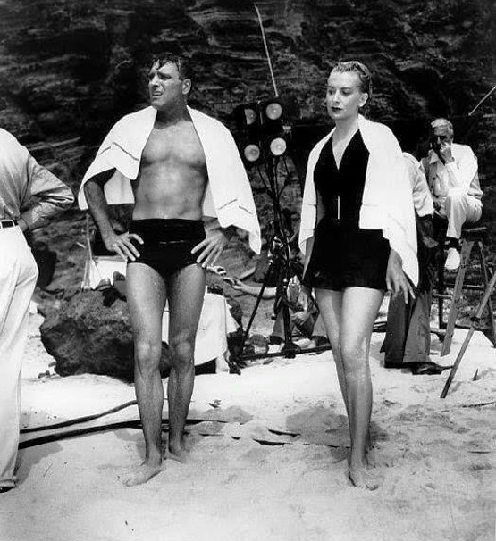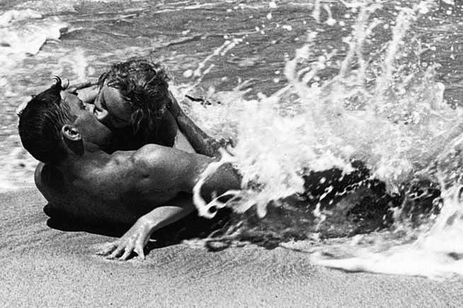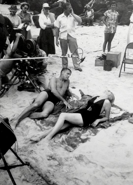 | Burt Lancaster e Deborah Kerr durante ensaios da famosa “cena de amor” na praia. |