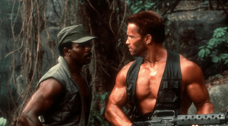 Em 1987, um grupo de soldados liderados pelo Major Dutch (Arnold Schwarzenegger) é enviado às selvas da América Central para uma missão de resgate mas cada um é caçado implacavelmente por um inimigo invisível vindo do espaço. A premissa de Predador (Predator) foi na época chamada de uma mistura de Rambo e Alien, e se beneficiou do auge da fama de Arnold Schwarzenegger como herói de ação da década, recém saído do bem sucedido Comando Para Matar (1985). Ainda no elenco o ex lutador Jesse Ventura e Carl Weathers, o eterno Apollo Creed. As filmagens, do diretor John McTiernan (Duro de Matar), na selva foram difíceis para todos os envolvidos não apenas pelas altas temperaturas durante o dia, convivendo com cobras, sangue-sugas e outros animais, fora o frio das filmagens noturnas em que Schwarzenegger teve o corpo todo coberto de lama para se camuflar. Os dois primeiros dias de filmagens tiveram Jean Claude Van Damme, na época um desconhecido, vestindo a pesada roupa e maquiagem de Predador. Van Damme, não aguentando o rigor das filmagens foi dispensado e substituído por Kevin Peter Hall, de “Um Hóspede do Barulho” (1987)