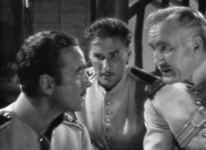 O Major Vickers, entre o Capitão Randall (David Niven) e o Coronel Campbell (Donald Crisp), pai de Elsa, para decidir detalhes dos planos para deter Surat Khan.
