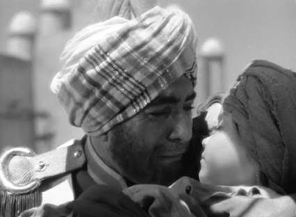 O oficial indiano Puran Singh (J. Carrol Naish) chora ao segurar o corpo do filho, Prema, morto no massacre no forte liderado por Surat Khan.
